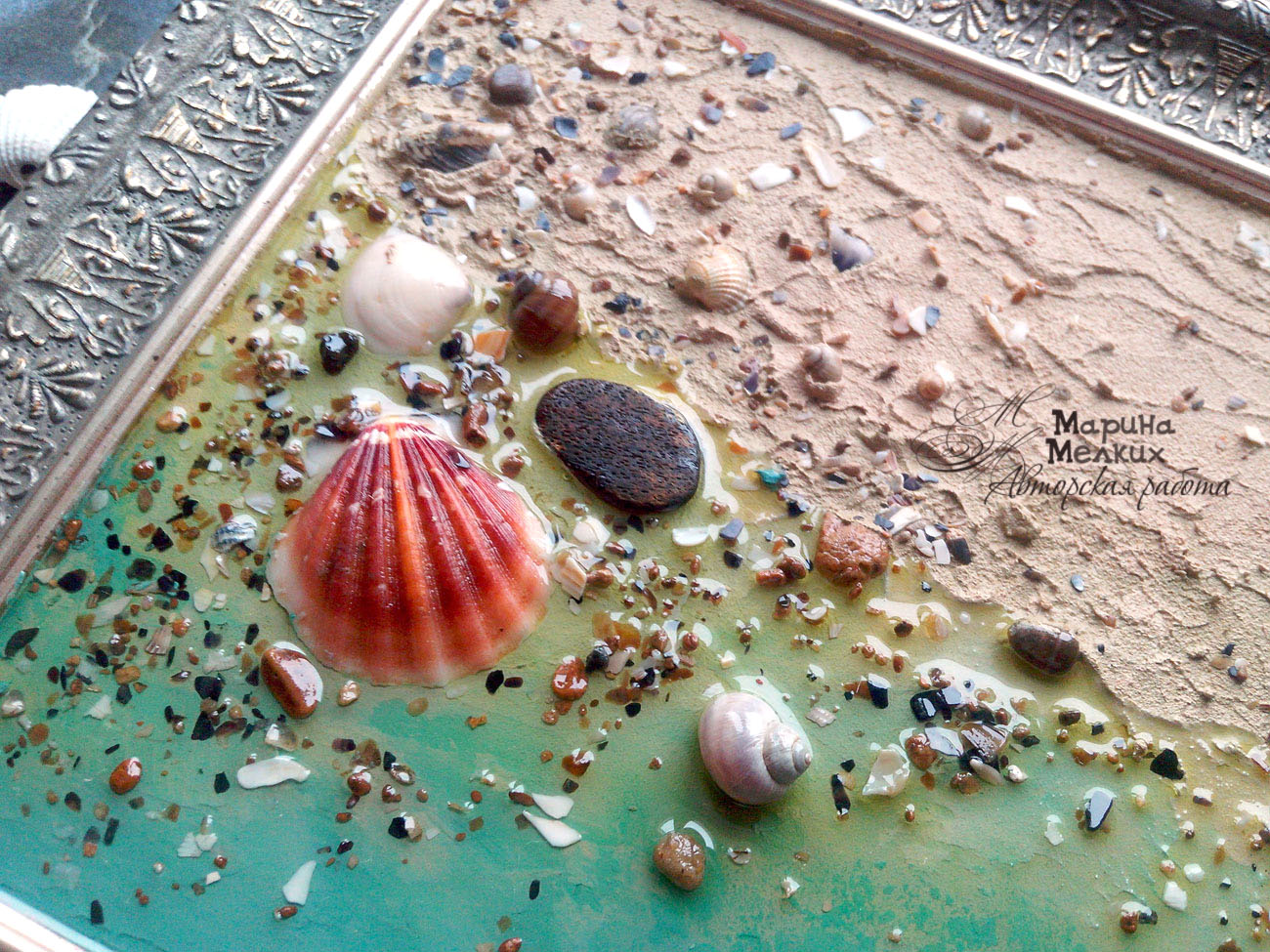 Песок сделан структурной пастой - грубой с песком с добавлением акриловой краскиМоре сделаноэпоксидной смолой по акриловой краске